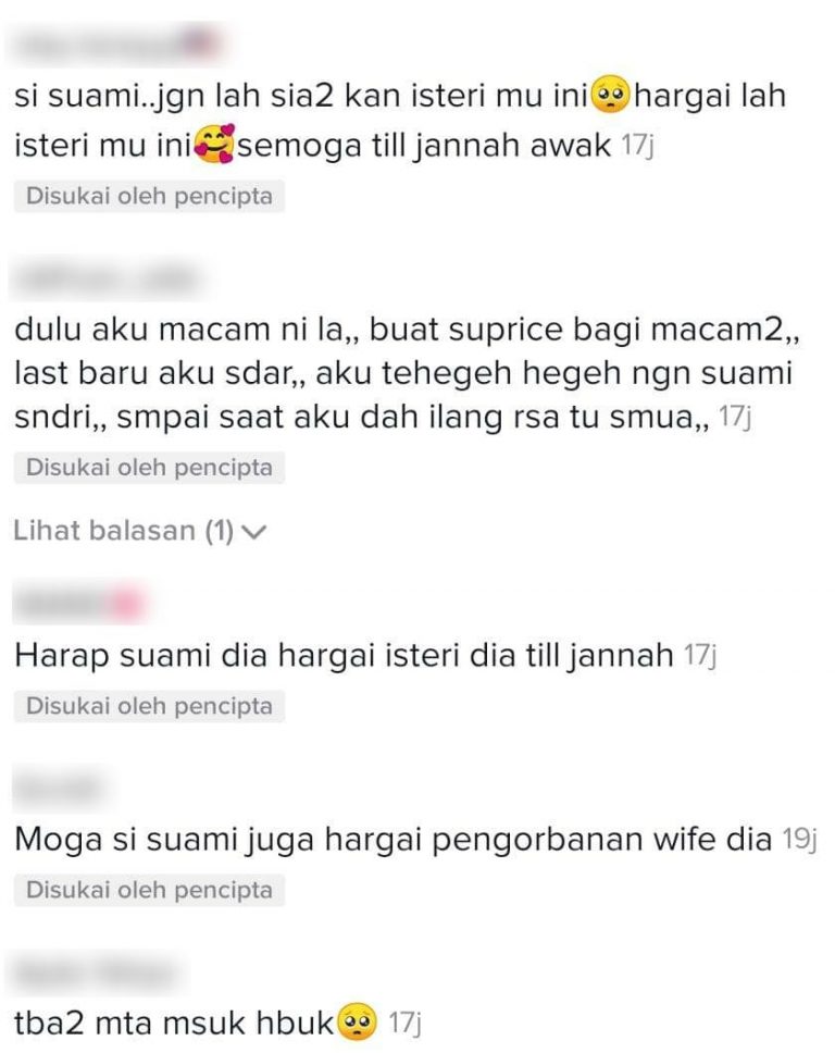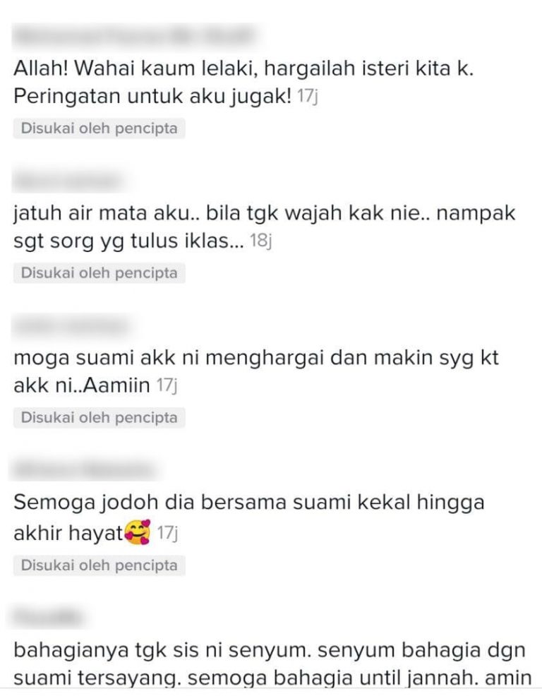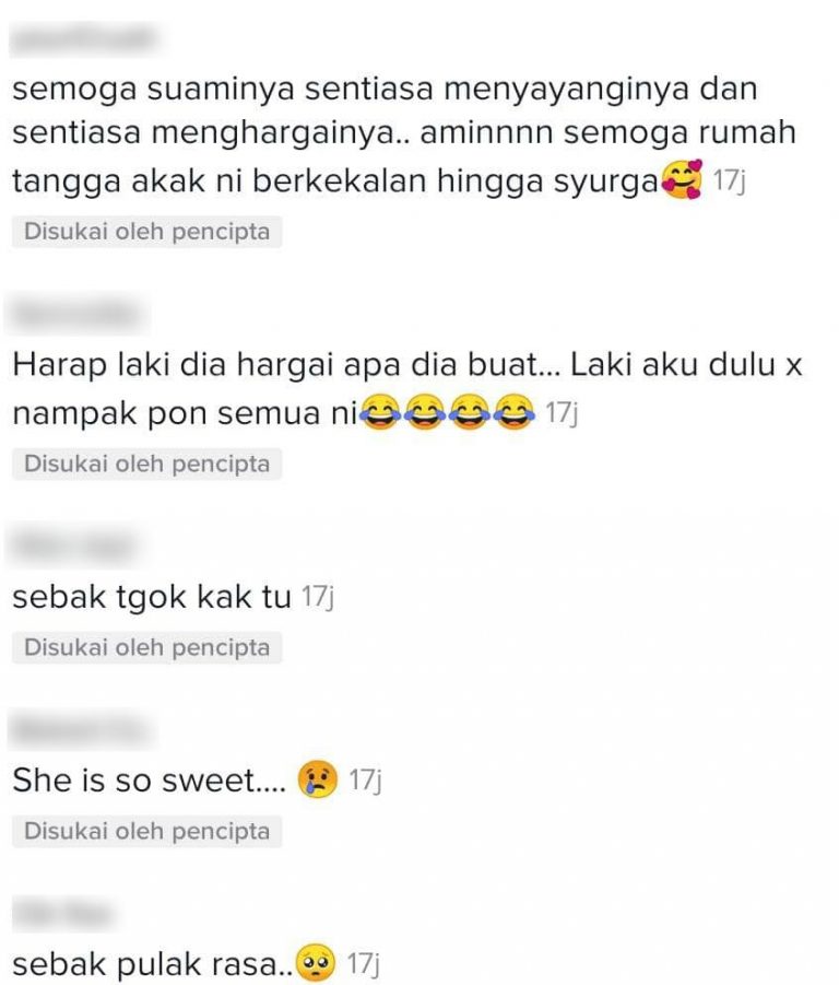 Menjengah ke ruangan komen, rata-rata netizen mengakui bahawa berasa sebak tatkala menyaksikan usaha wanita berkenaan demi menggembirakan suaminya. Selain berharap si suami akan menghargai, mereka juga perasan bahawa senyuman ikhlas itu sudah cukup menggambarkan kebahagiaan dalam rumah tangganya. Secara keseluruhan, video tersebut telah meraih 15 ribu jumlah tontonan setakat ini.