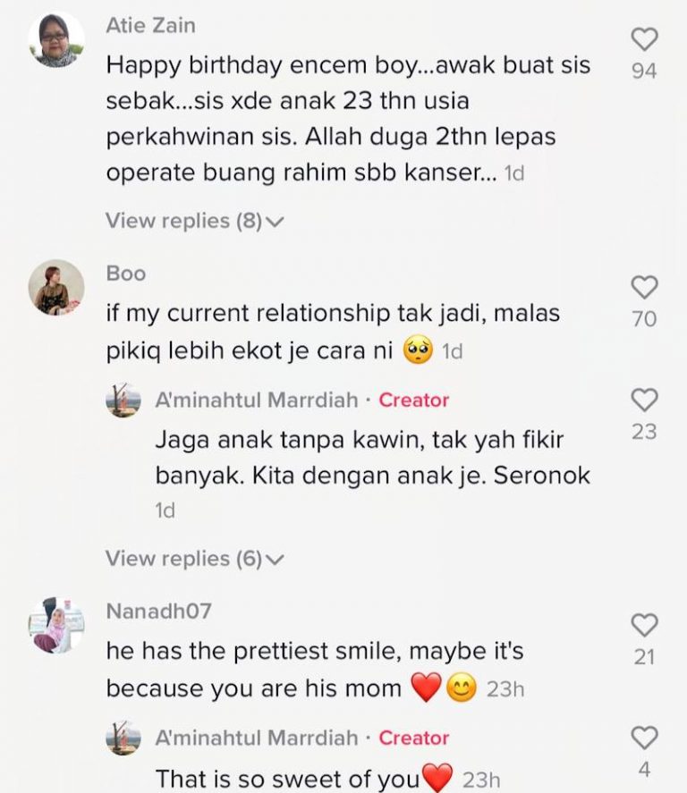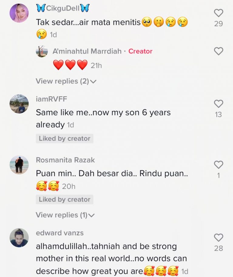 Perkongsian Aminah itu telah dibanjiri komen-komen yang positif daripada warganet yang memuji kekuatan dan kegigihannya menjaga anak angkat.